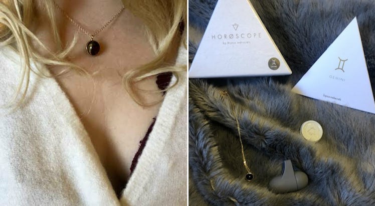 According to the companies, the set "brings together astrology and pleasure as well as spirituality and wellness in 12 unique sets to match each sign of the zodiac.” My Gemini kit came in a cute triangular-shaped box. Inside, there was an adorable little bullet vibrator, a clitoral balm designed just for my sign, as well as a crystal necklace made with my sign's energy in mind. The cream was a star anise scented — made specifically for air signs like me to push negative thoughts from the mind and body and allow for a more intense connection with your feelings. It smelled pretty mild — almost like a chai latte — and the texture was creamy and luxurious. The necklace was super cute, too. Geminis get Tiger’s Eye, which is said to dissolve insecurities and boost self-esteem.