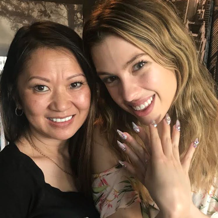 Cardi's longtime nail artist, Jenny Bui, greets me with a hug. She is smiling and seemingly happy to see me, even though I am, embarrassingly, 20 minutes late (unavoidable transportation glitch!). Jenny beckons me to the back of the salon, behind a door labeled "Jenny's room." Turns out, said room is a VIP suite of sorts, reserved for individual clients. The space itself seems to sparkle, thanks to various crystal-encrusted objects lying around. Of course, there is a nail polish wall. There are also two bottles of Grey Goose, a blown up photo of Jenny and Cardi together, and more bling (so much bling!). I am in awe of all of the sparkly stuff, but perhaps I shouldn't be surprised. After all, Jenny is known as the Queen of Bling — a title she has acquired after creating sparkly masterpieces for a few decades. (I urge you to peep her gorgeous Insta!)