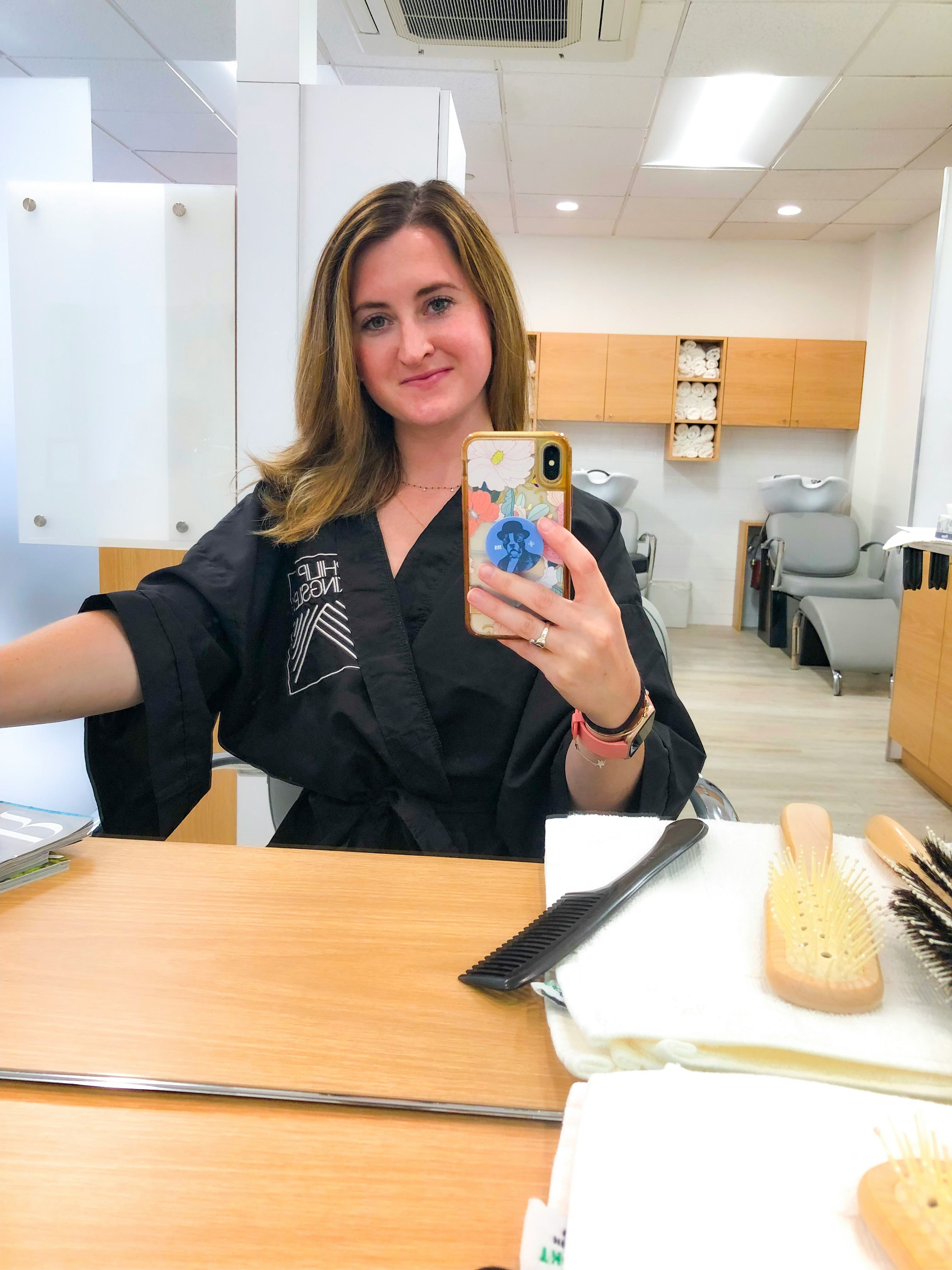 I'll admit I looked pretty funny with my scalp mask, but I trusted Pullan and the process. He continued with the treatment, wrapping my mane up in a bun with a hair claw clip and having me sit under a steamer to help open up my scalp’s pores and let the mask penetrate deeper.