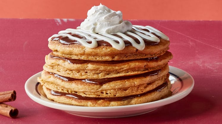 So, what are you getting when you order a stack of Pumpkin Cinna-A-Stack Pancakes? According to IHOP's menu, the new item is basically the original Cinn-A-Stack Pancakes made with IHOP's Pumpkin Spice Pancakes. For reference, the original Cinn-A-Stack Pancakes consist of four buttermilk pancakes layered with cinnamon roll filling (yum). Then, the stack is topped off with drizzles of cream cheese icing and whipped cream (double yum).