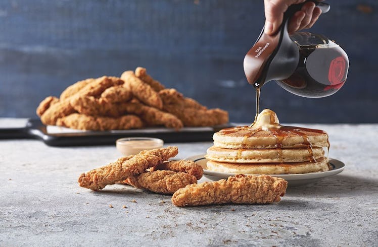 According to press materials, you'll be getting four buttermilk fried chicken strips paired with a stack of three buttermilk pancakes, which will, again, come with your choice of buttermilk ranch, honey mustard, or IHOP sauce. Still, I wouldn't be surprised if you want to just add some syrup in the side if you want to treat your tastebuds to some savory and sweet goodness. Again, this option is only $6.99 for a limited time, so you don't have to break the bank to keep those weekday scaries at bay.