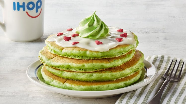 Dining in also comes with some serious perks, according to IHOP's press materials. From 4 p.m. to 10 p.m. during the Grinch promotion, kids under 12 can get their kid's entree free with the purchase of any adult entree while eating in. All in all, that means you'll have more money and energy to spend on decking out your tree and checking off your shopping list, not worrying about Christmas dinner.
