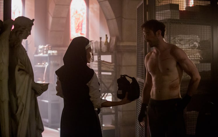 This year in the Netflix Marvel-verse has been all about the fallout from One Midland Circle, as each member of The Defenders moves on with their lives. But Jessica, Luke, and Danny came out of the disaster relatively physically unharmed. Matt Murdock, on the other hand, was underneath the building when it came crashing down, and is presumed dead. When The Defenders ended, viewers saw he was alive and well, and being tended to by nuns, including the new character Sister Maggie. But fans can't help but wonder: Is Sister Maggie Matt Murdock's mother?