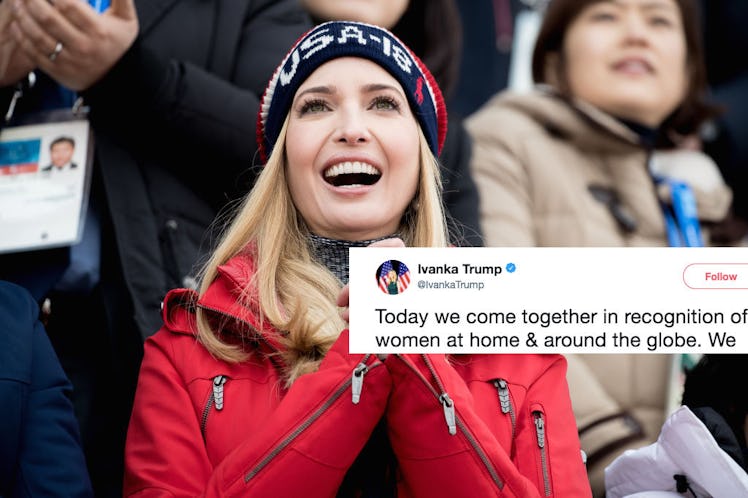 On Thursday, March 8, the world celebrated International Women's Day. International woman Ivanka Trump, naturally, wanted to get in on the joy-spreading as well, and she took to social media to recognize the day. However, the first daughter doesn't exactly have the best track record when it comes to public displays of feminism. As such, Ivanka Trump's International Women's Day tweet was hounded with backlash about as soon as she posted it on Thursday morning.