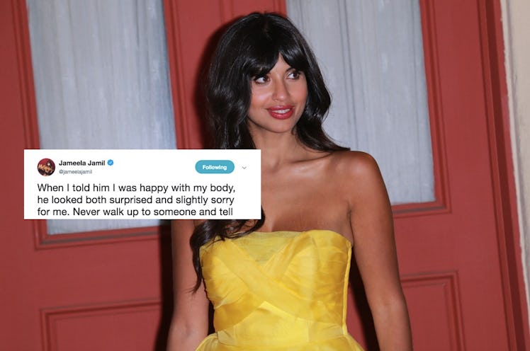 When someone makes a remarkably ignorant comment about another person's body, there's always that moment of surprise when you can't believe it's really happening, just before you return to Earth and remember that, unfortunately, these things happen all the freaking time. Personally, that's the exact reaction I had when I saw British actress Jameela Jamil's response to a body-shamer at the gym on Twitter. Jamil recounted the very cringeworthy interaction in a video she recorded and posted on social media, in which she described how some rando dude strolled up to her, unprompted, to give her his opinion about her body. Le sigh.