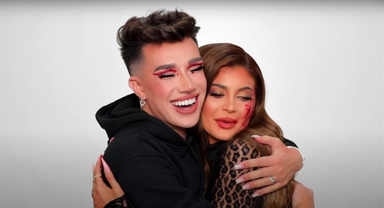 At long last, in honor of ~spooky season~, James Charles and Kylie Jenner reunited for another Halloween video, two years after their first YouTube debut together. The first time around, Charles and Jenner's Halloween tutorial involved a colorful, half-skull makeup look that, despite it being spooky and all, still looked as glam ass both beauty moguls always do. For their second Halloween video, Charles and Jenner demonstrated a much bloodier, special effects makeup look in honor of the Kylie Cosmetics cheetah-themed Wild Side collection.