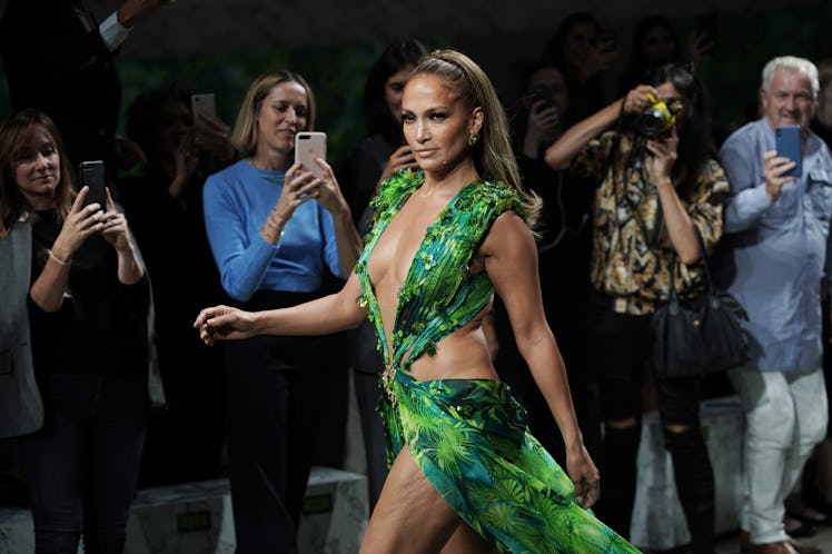Even though the internet may not have been as prominent in 2000 as it is now, you'll remember that Jennifer Lopez definitely did break the internet when she donned her infamous green Versace dress at that year's Grammy Awards. Still, that iconic dress is forever burned into everyone's mind. Of course, leave it to the 50-year-old to, almost 20 years later, break the very prominent internet after rocking the iconic dress once again. On Friday, Sept. 20, Jennifer Lopez closed Versace's Spring 2020 fashion show in a remake of the dress and showgoers, along with literally everyone on social media, went absolutely wild.