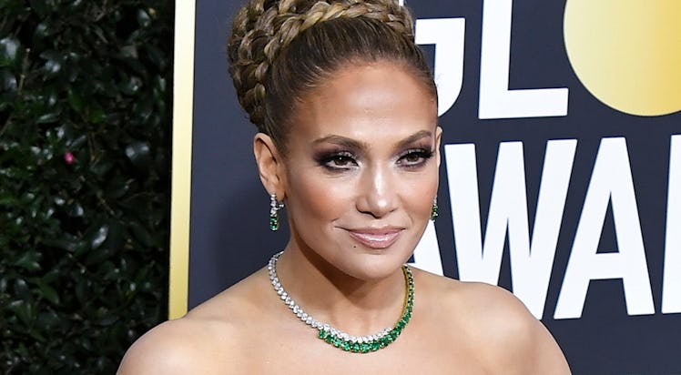 After hearing that J.Lo was nominated for Best Supporting Actress in a Motion Picture for her role in Hustlers, I knew the movie's entire cast of badass women would show up to the Globes looking incredible. Still, I was counting on Lopez to wear her usual: something form-fitting and sequined, paired with long, bombshell waves. Imagine my surprise when she hit the carpet serving Queen of the St. Patrick's Day Parade Float vibes — and believe me, I mean that in the best way possible. Lopez stepped out of her comfort zone with a kelly green, ivory, and gold dress paired with matching green jewels and a braided bun styled by Chris Appleton using Color Wow products and Dyson tools. Get you a red carpet icon who can do it all, people!