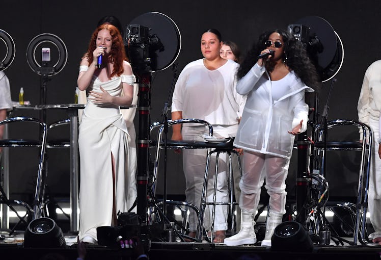 This is why Glynne and H.E.R.'s moment of female solidarity, which came while the two performers were singing their duet, "Thursday," was so very powerful. "Sometimes I try to embrace all my insecurities/ So I won’t wear makeup on Thursday/ ’Cause who I am is enough,” sang Glynne as she removed her false eyelashes and wiped away her makeup with a cloth round.