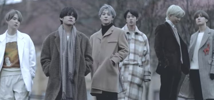 As always, the video — directed and edited by Jungkook — showed BTS from the youngest member's perspective. With Talos' "To Each His Own" playing in the background, the clip paid close attention to each of the members, and, while the majority of the video was super focused, solemn, and attentive, there was one short break in the middle. At the 0:52 mark, Jimin began playfully roughhousing with Jin and J-Hope before the screen went black, Jungkook sniffled, apologized, and then the video returned to its more serious tone. (You can always count on Jungkook to work in a bit of his funny personality — even into an earnest video like this one.)
