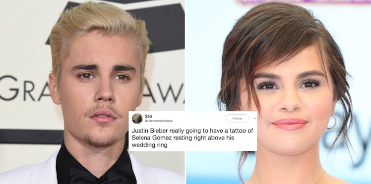 People on Twitter are pointing out the hella awkward fact that Bieber's Selena Gomez tattoo is on his left wrist, just a few inches above where his wedding ring will be. Double yikes.