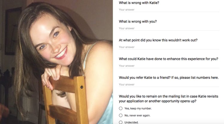 The survey questions range from the delightfully straightforward "What is wrong with Katie?" and "What is wrong with you?" to "What could Katie have done to enhance this experience for you?" There's also an option for survey recipients to refer Katie to a friend who might be a better match.