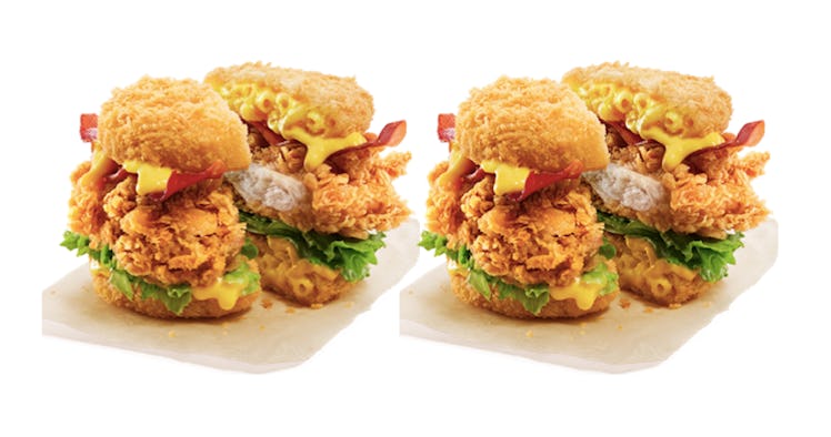 If you've ever taken a few weeks off to travel to Southern Malaysia, hopefully you got the chance to stop into a local KFC. One of their latest and greatest menu items is called the Mac 'N Cheese Zinger, per Delish, and let me tell you, it's making me seriously consider taking that 24-hour plane ride from New York City. According to KFC Singapore's website, the Mac 'N Cheese Zinger, which was released on Feb. 13, consists of a KFC Zinger chicken fillet, turkey bacon, lettuce, and cheese sauce, according to the KFC Singapore website. All of that is delicately sandwiched between two crispy mac 'n cheese patties, and to be completely honest, it is the comfort food of my dreams. And luckily for those in Singapore, they're here just in time for the most romantic day of the year: Valentine's Day. Nothing says "I love you" quite like deep-fried everything.