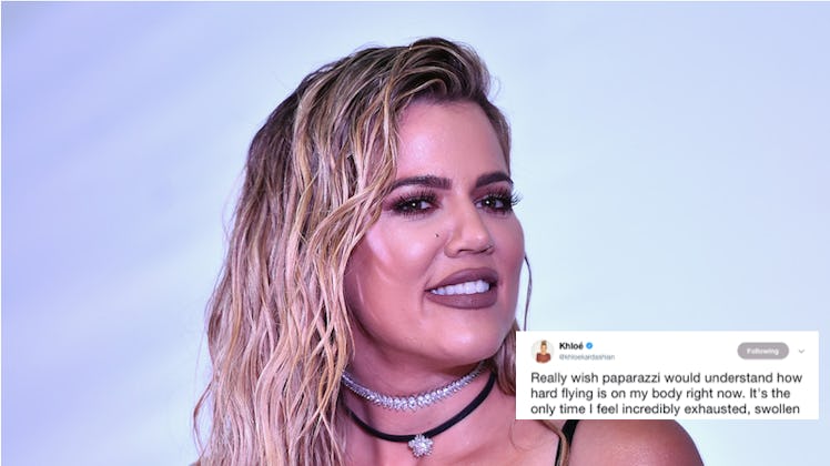 The Kardashians are not a family typically known for shying away from the limelight. Unless, of course, you're Kylie Jenner and the entire world is scrambling to catch a glimpse of you and your reported baby bump. Then you fly completely under the radar by going into hiding. But let's face it — for the most part, this is a crew that has built an entire brand by letting the cameras into their lives. Of course, that doesn't mean reporters should expect to have carte blanche to document the family's lives 24/7. Now an expectant Khloé Kardashian is calling out the paparazzi on Twitter — and TBH, I kind of don't blame her!