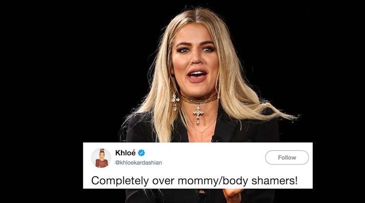 One of my favorite things in the whole world is when Khloé Kardashian goes to bat for body positivity. Ever since the birth of her daughter, True, she's been combatting some serious trolls on everything from her parenting decisions to her post-baby body and it looks like she's finally had enough. Khloé Kardashian's message to mommy-shamers policing her body is just one of my favorite clapbacks she's delivered in her short time as a new mom. Plus, it resonates with me even though I'm not a mother, because guess what? Loving your body is hard and comparing yourself to other people sucks. I'll take a little self-love motivation wherever I can get it!