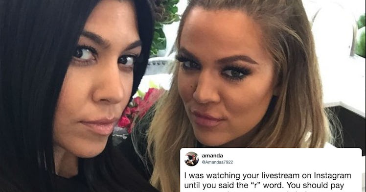 Khloé Kardashian shares a whole lot of her private life with fans via social media. And sometimes, that means she’s sharing her mishaps as well as her successes. On Friday, July 20, Kardashian live streamed a get-together with her sister Kourtney Kardashian on Instagram and, in the video, both used an offensive word that had fans reeling. When called out, Kardashian was ready to own up to it. Khloé Kardashian’s response to backlash over saying the r-word is a perfect example of how to check yourself when you've done something wrong.
