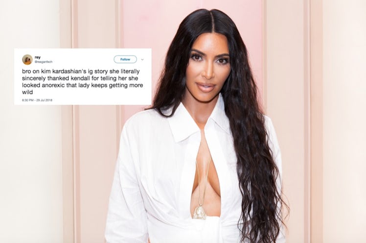 On Sunday July 29, the reality-star-turned-supermodel Kendall Jenner "complimented" her older sister, Kim, on her apparent weight loss. But to Kim's followers, the so-called “compliment” was wildly inappropriate, as Kendall's remarks like, “I’m really concerned, I don’t think you’re eating,” and, “you look so skinny,” became a kind of prologue to a series of similar videos Kim uploaded to her Instagram story. Elite Daily has reached out to Kim, Khloé, and Kendall's teams for comment on the backlash, but did not hear back at the time of publication.