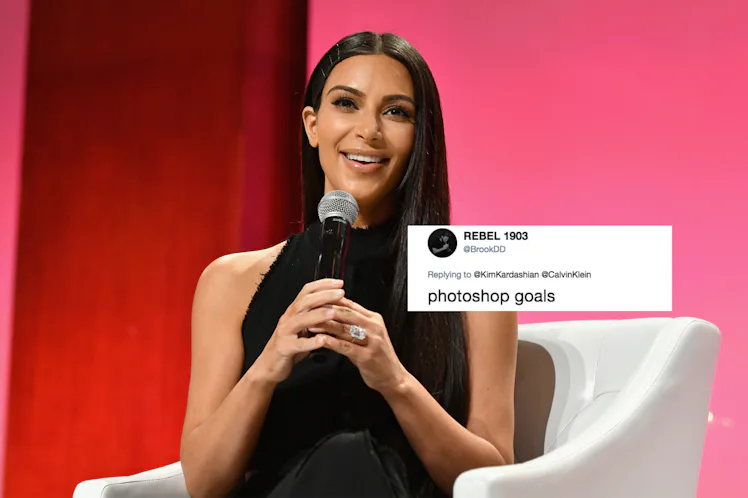 Haters will say it's Photoshop. Kim Kardashian is getting hate online again from fans who claim she altered a selfie she posted to Instagram on Wednesday, April 4. In the photo, Kardashian is posing in front of a mirror wearing black Calvin Klein underwear. Kim Kardashian's "Photoshopped" Calvin Klein selfie might not look altered at first glance, but people are arguing that when you look closely at the bottom half of the photo, there are some odd curves where curves shouldn't be. Elite Daily reached out to Kardashian's team for comment on the image and the claim it's Photoshopped, but did not hear back by the time of publication.