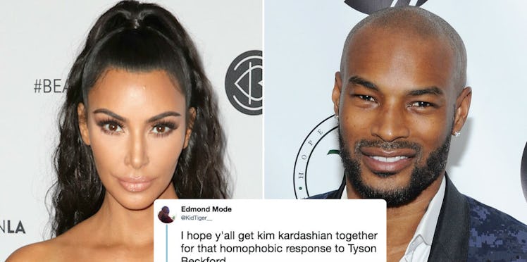 It seems like Kim Kardashian is misstepping with every move she makes this week. She's been receiving harsh and warranted criticism on social media as a result of her pushing negative and triggering body standards, saying she has "nothing bad to say" about Donald Trump, and now, making homophobic comments in the name of defending her body. Tyson Beckford posted a body-shaming comment on Instagram about Kim Kardashian (which is also unacceptable on his end), and Kim Kardashian's response to Tyson Beckford body-shaming her is problematic as hell.
