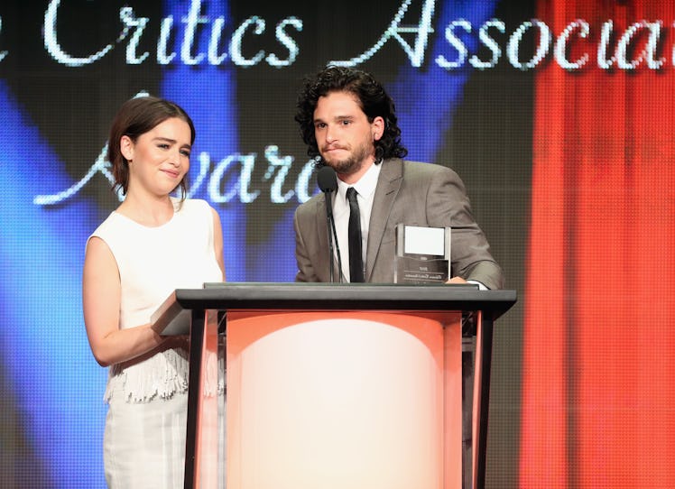 With Game of Thrones' filming schedule altered to run through the winter months, the award show circuit for its actors has become a little awkward. Instead of being finished with the coming season in December, actors are now having to fly from the GOT set in Europe to Los Angeles in order to participate in awards shows. This is especially frustrating when GOT only has one nomination, and a cursory one at that, at this year's Golden Globes. To assure fans of at least some attendance, the Hollywood Foreign Press Association announced that Kit Harington and Emilia Clarke will present at the Golden Globes this coming Sunday, Jan. 7.
