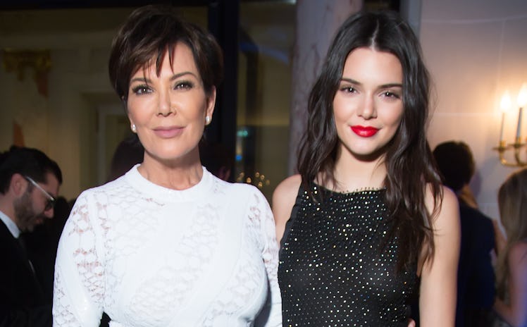 Kris Jenner never stops being a mom, even on the Met Gala red carpet. Out of her five daughters, three of them attended the 2018 Met Gala together on Monday, May 7, and Kim Kardashian, Kendall Jenner, and Kylie Jenner all came slaying their looks (even if they weren't the most loyal to the whole Christianity theme). Kendall Jenner wore a white Virgil Abloh jumpsuit that some fans trolled for looking like toilet paper, but other fans loved. Kris Jenner met up with her model daughter on the red carpet, and Kris and Kendall Jenner's 2018 Met Gala moment will hilariously make you want to call your mom.