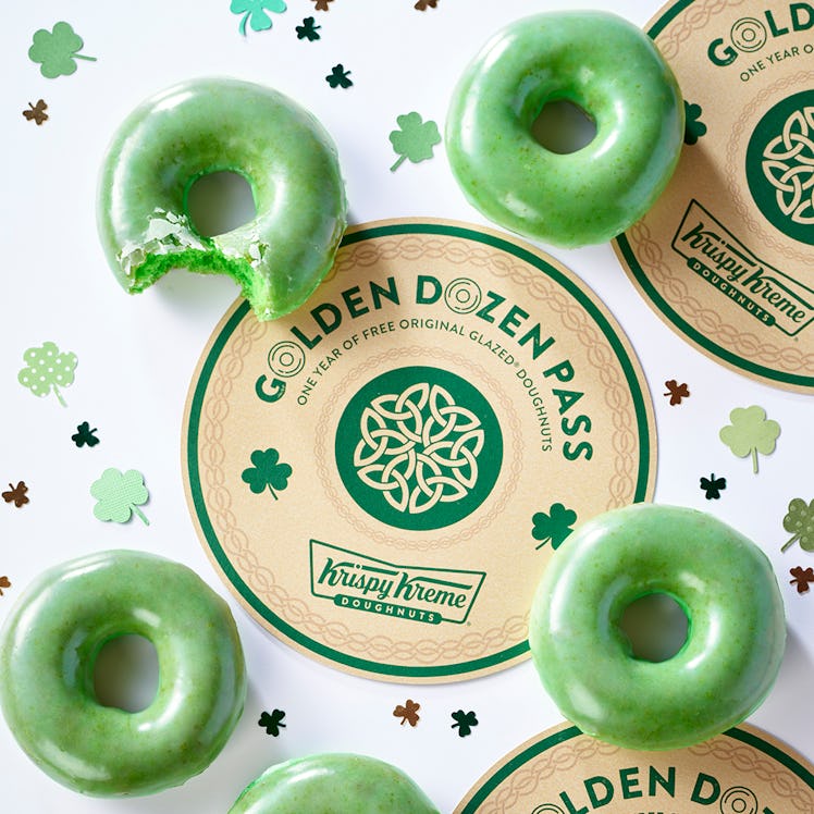 While there's no purchase necessary to try your hand at winning the new Golden Passes, there is a pretty tasty incentive to do so. Krispy Kreme's green "O’riginal" Glazed doughnut is back from Friday, March 15 through Sunday, March 17 to give you a very festive and leprechaun-approved option for the weekend. You're getting a dozen of the chain's Original Glazed doughnuts that have been specially dyed green for the occasion, which makes the treat a fitting accompaniment to help you get in the spirit of things (Plus, how cute would it look in your St. Patty's day 'Gram?).