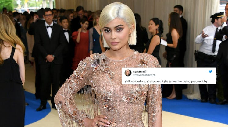 HOLD UP, everyone. We need to talk about something pretty big. Like, Kim Kardashian revealing her surrogate big. ONLY BIGGER. Apparently, there's been some ~gossip~ going around town that Kylie Jenner's pregnancy was sort of revealed, only not in the way you'd expect. Kylie Jenner's pregnancy announcement "clue" on Wikipedia is making the world go absolutely wild, because, hello, WE'VE BEEN WAITING FOR THIS MOMENT FOREVER, and excuse me, a Wiki-leak is how it might be happening? Sorry guys, but it looks like we shouldn't get our hopes up just yet, because a representative from E! has told Elite Daily the Wikipedia information is false. I know, I know, I'm totally killing your buzz, but somebody has to do it. But even though we've confirmed that these Wiki-rumors are totally not true, that's not stopping fans from freaking the eff out.