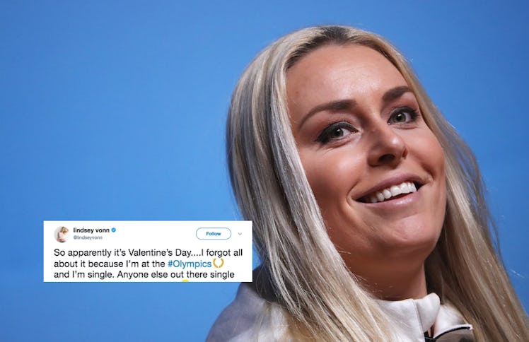 You'd think that Vonn — a badass, beyond-talented, gorgeous and strong woman — would have zero problem finding someone to send her some roses for Valentine's Day, but Vonn took to Twitter to admit that she not only doesn't have someone to buy her chocolates, but that she literally forgot that today was even a holiday. Too busy crushing Olympic world records, I guess? (Like I said, we can't even blame her.)