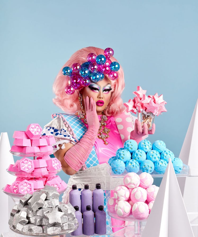 And finally, there's Kim Chi (RuPaul's Drag Race Season 8), who looks like the festive sugarplum fairy of your wildest dreams. “There’s a lot of fun vibrant colors, and I tried to mix a lot of prints, textures and colors. So a quilted masterpiece is what I’m serving you," she told Refinery29. She's also serving up an array of six different Lush products: Lush Cheery Christmas Bath Bomb ($5.95, lush.com); Lush Holey Night Bath Bomb ($6.95, lush.com); Lush Snow Fairy Jelly Bomb ($6.95, lush.com); Lush Star Light Star Bright Luxury Bath Melt ($8.95, lush.com); Lush Magic Wand Reusable Bubble Bar ($8.95, lush.com); and Lush Sleepy Naked Shower Gel ($9.95, lush.com).