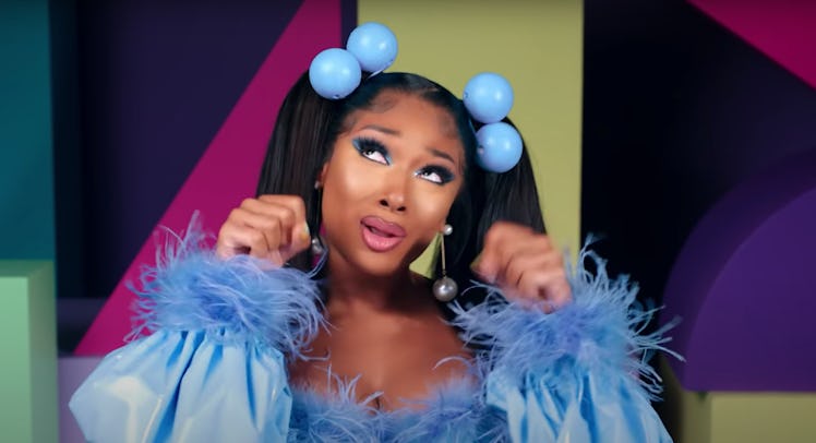 For her music video looks, Megan went to one of her go-to stylists Brookelyn Styles. The New York creative previously worked with Megan for her "Body" music video. This time around, however, rather than a mostly black, fetish-wear aesthetic, Megan was dripping in colors and fun accessories straight out of the early 2000s. That's not to say that the video wasn't filled to the brim with latex, of course. Megan rocked a few custom-made looks from designers Venus Prototype and Bryan Hearns.