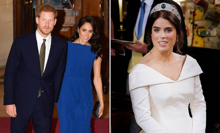 On Friday, Oct. 12, Princess Eugenie and Jack Brooskbank said their "I dos" in front of 800 guests at St George’s Chapel at Windsor Castle. While I could literally talk about their gorgeous wedding for hours on end, let me instead stick to what we really want to talk about, and that's Harry and Meghan breaking all the rules.