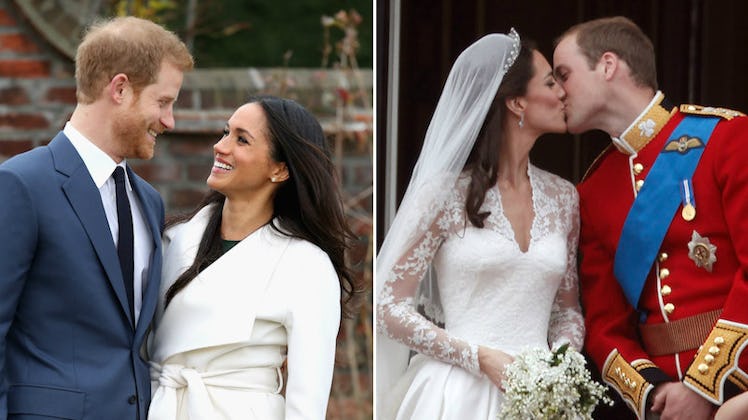 I couldn't be any more hyped at the idea that we will once again be having another royal wedding. Believe it or not, it's been a whole 7 years since Prince Harry's older bro, Prince William, married the wholesome and lovely Kate Middleton. So yes, we are very prepared to break out our finest tea sets to watch Meghan Markle walk down the aisle to marry Prince Harry come this May. And, while every wedding is a (very expensive) unique snowflake, there are some weddings that seem a bit... unoriginal. The bride's gown is beautiful, the cake is white, the DJ plays the same song, blah, blah, blah. But if you so much as think that this royal wedding will be exactly like the last, I have some news for you. Meghan and Harry's wedding compared to William and Kate's is so, so different, and I'll tell you why.