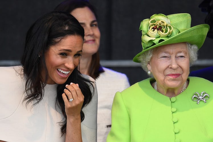 Meghan Markle and Queen Elizabeth seem to be getting along great. The two are having a special set of royal appearances together on June 14, and they're special because they mark Meghan Markle's first appearance without Harry. It also marks a first for Meghan that not even Harry has gotten to do: she traveled to the engagement on the royal train. Ohhhhh! Ahhhhh! A trainnnnn! According to a series of tweets from Kensington Palace, Queen Elizabeth and Meghan Markle traveled overnight on the royal train from London to Cheshire for their first royal engagement attended by just the two of them.
