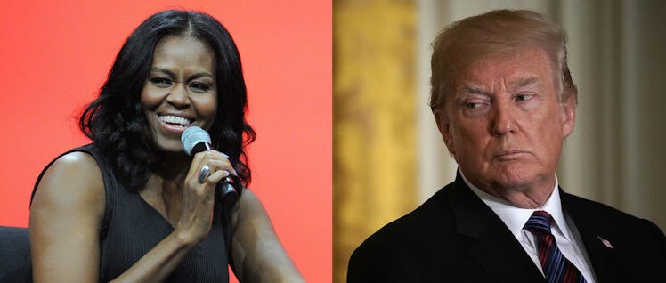On Thursday, April 5, Michelle Obama had the opportunity to talk about President Donald Trump, and — #bless — she did not hold back. The former first lady was very clear about how she thinks Trump has been doing as president, especially as it compares to how her husband did. And if you've been looking for a way to succinctly describe how the two are different as president, Michelle Obama's comparison of Trump as a parent is just so exactly perfect.