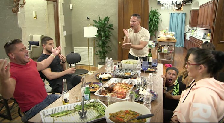 The ending of last week's episode had clearly been leading to the inevitable Mike and Ronnie blow-up, as Ronnie walked in the room after Mike was telling the rest of the house that he thinks Ronnie needs professional help. That did not sit well with the rest of the house, especially JWoww, who said that if Mike really thought that Ronnie needed counseling or rehab, he should tell that to him privately instead of whispering about it behind his back. As we all know, JWoww is not one to keep quiet when she does not like something, and she brought up Mike's comments over the group's final dinner together. I mean, the Jersey Shore cast could not just leave the house without one last fight, right? Thanks, JWoww!
