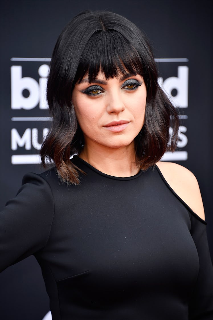 The subtle ombre was pretty much the only splash of color for Kunis' red carpet look for the 2018 Billboards. The freshly-cut fringe matched the raven-haired beauty's makeup look, which consisted of a smoky black eyeshadow that extended slightly beyond her lids, creating a faux cat eye effect. The sultry look was finished off with a healthy dose of kohl eyeliner drawn into her waterline. Kunis' nails were lacquered in a metallic hue, which paired perfectly with the mirrored accents on her skirt.