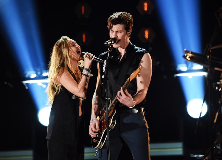 Seriously, Cyrus seemed to be in high spirits, and she's been hyping up working with Shawn Mendes all week, so we know she was excited to join him in singing his hit, "In My Blood." And while this is one of my favorite "headphones in, driving while it rains, leaning my head against the window" hits, the vibe felt more rock and roll than somber during their performance, as the duo was really rocking out! Cyrus definitely went for that old-school rockstar vibe with her outfit, and paired messy waves with the most ballsy take on a suit I've seen in quite some time.