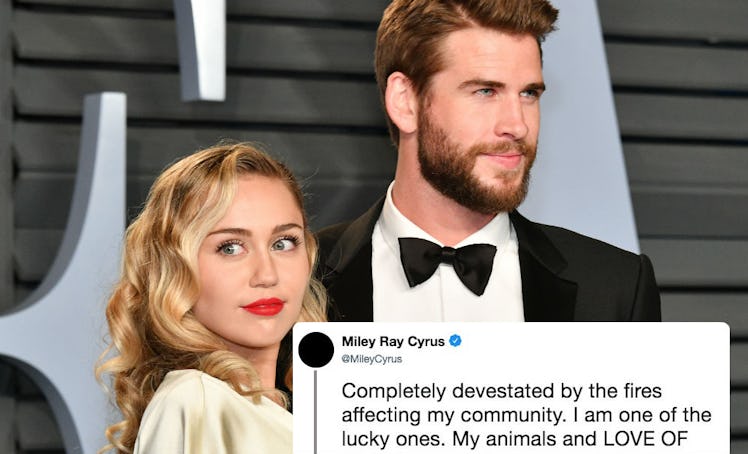 "Completely devestated by the fires affecting my community," Cyrus tweeted early in the morning of Nov. 12. "I am one of the lucky ones. My animals and LOVE OF MY LIFE made it out safely & that’s all that matters right now." The love of her life she's referring to is Liam Hemsworth, with whom she shared the house in Malibu with their litany of pets, all of which made it safely out of the house as well.