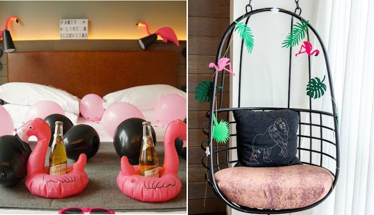 The "Get Flocked" package offers you the chance to turn your room into a flamingo-inspired Instagrammable playground. You'll enter the room with flamingos and black and pink balloons scattered around the room, pink lights in the lamps, flamingo twinkle lights, and, of course, welcome drinks in inflatable flamingo coasters.