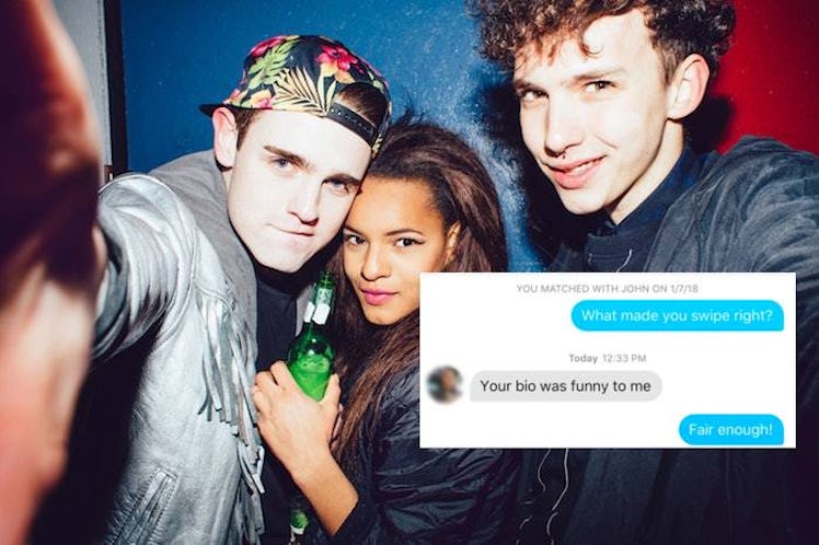 I typically share my most interesting Tinder conversations with my two best guy friends — Jon, 26, and Mo, 30 — and I love getting their feedback. It's actually way more honest than my girl friends', and their perspective, as two heterosexual guys, is so different from my own, which helps me navigate the dating world with a bit more confidence. Helpful as they are, though, they enjoy the casual joke at my expense every now and then, and this experiment was no different.