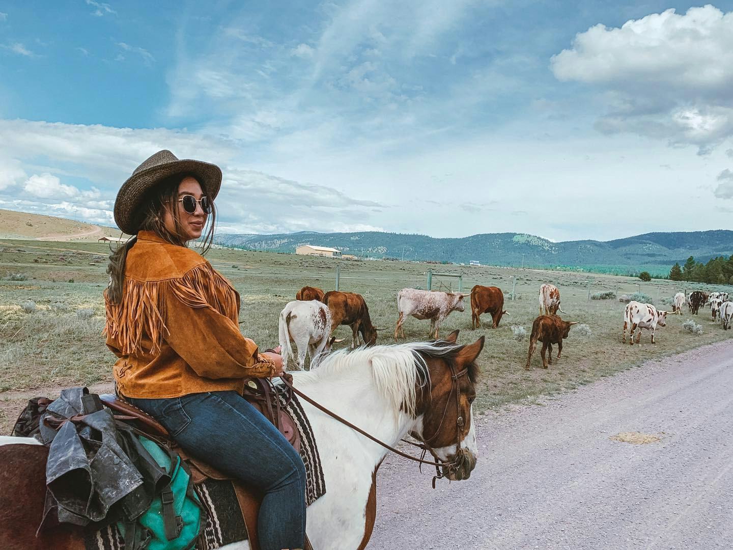 One activity I was really excited to do was the cattle drive. I've ridden horses a few times, but had never done a ride quite like this, where we really had to guide the cattle to and from their pasture. Being on a horse is already amazing, but the incredible valley views made the whole experience even more epic. Plus, I had the chance to go all-out with my wardrobe choice. I broke out my vintage fringe jacket, my bluest pair of jeans, and of course, a cowboy hat and pair of cowboy boots.