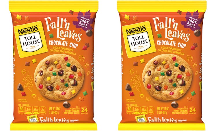 That's right: Nestlé Toll House will be releasing Fall'n Leaves cookie dough in honor of the spooky season, per Brand Eating. Based off of the product's packaging, the cookie dough (which comes ready to bake) will include "100% real" chocolate chips and leaf-shaped sprinkles. Apparently, the sprinkles will be red, orange, yellow, and green in color, similar to actual "fall'n" leaves that'll be in your yard when the temperatures drop. Thanks to those sprinkles, the Fall'n Leaves dough will make the cutest cookies to kick off the season with.