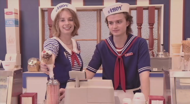 The new Stranger Things trailer takes the form of a retro commercial for the Starcourt Mall in Hawkins, Indiana, which definitely makes it seem like this mall will be a major location in Season 3. Only one of the main characters from the show appears in the trailer: Steve Harrington. After a chipper-voiced narrator introduces viewers to a bunch of '80s stores in the new mall, we see Steve Harrington behind the counter at Scoops Ahoy ice cream shop.