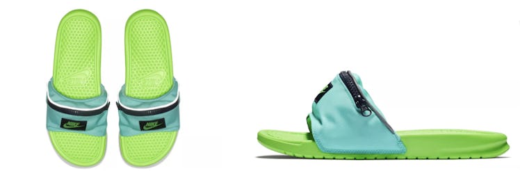 As reported by Hypebeast, the style is the newest iteration of Nike's iconic Benassi JDI slides, the treaded slip-on sandals that bare the Nike logo on their strap. They've gotten a wacky upgrade with bright new color ways and, of course, a mini fanny pack in place of the classic strap. The three new color combos include a lime green footbed with a turquoise blue fanny pack; a black footbed with a deep pink fanny pack; and a black footbed with a black fanny pack. The last offering is certainly the most subtle, though I'm partial to the more outlandish colors — they're super '90s and I could see The Fresh Prince wearing them.