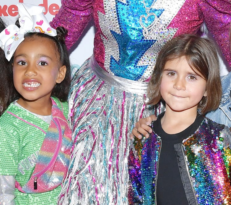 The birthday girls themselves took a cue from the colorful theme, and they totally dressed the part. In a pic shared to Kourtney's Instagram Story, you can see Penelope, who turns 7 in July, and 6-year-old North standing with their arms around each other as Kourt's daughter sports a sky-high headband that looks like an oversized lollipop and Kim's eldest daughter dons rainbow-colored hair. TBH, they both look Candy Land chic with their sweets-inspired duds, and I'm very here for it.