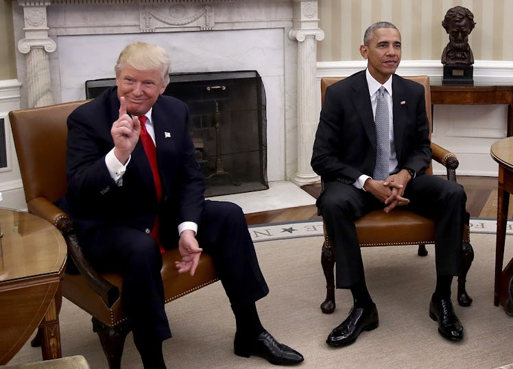 We always knew that the relationship between Barack Obama and Donald Trump was no cakewalk: Each of them has agendas that only complicate the other's, Trump is continually scraping away parts of Obama's legacy, including the Affordable Care Act (ACA) or Deferred Action for Childhood Arrivals (DACA) protections, for example. And — on a more personal level — both of them have taken shots at each other on multiple occasions. But when Obama left the White House, he seemingly went out like a champ. On Inauguration Day, he greeted Trump with all smiles, and before that, he pledged to help him have a smooth transition into office when they met for a meeting at the White House. But now, a new book says that Obama's reaction to his first meeting with Trump was full of "disbelief," and it's pretty interesting to hear.