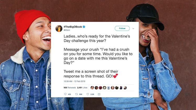 Feb. 13 means it's that time of year again: When, despite being single, you're overcome with the heart-wrenching spirit of St. Valentine, so you've still got the perfect red sweater or pink bodycon dress on deck (and a makeup look to match!). And while you may be toasting your best friendships tonight for Galentine's Day, alas, no boo has showed up to be your Valentine. Enter Oloni's Valentine's Day challenge on Twitter to upgrade your love life. The annual challenge comes from the brilliant mind of London-based sex and relationships content creator Oloni.