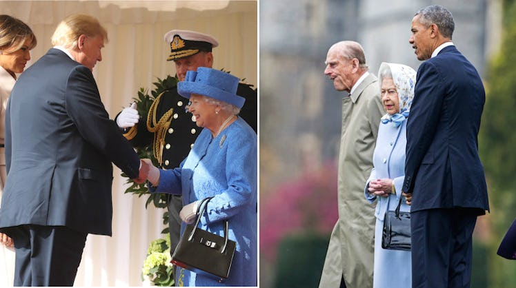 When it comes to impressing Queen Elizabeth, it can't be an easy feat. On July 12 and 13, Donald and Melania Trump are visiting the U.K., and their lengthy agenda involves a visit to the queen herself. Donald Trump has certainly established himself as a controversial president, so I was definitely interested to see how he and the queen would get along. Now that we've got an inside peek into their meeting, these photos of Queen Elizabeth with the Trumps versus Obamas reveal so much.
