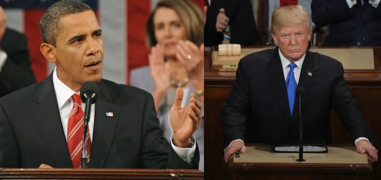 While it oftentimes seems like President Donald Trump has held his elected office for longer than just over a year, the fact remains that he gave the first official State of the Union address of his presidency on Tuesday night, Jan. 30. The State of the Union address has become an accepted tradition for sitting presidents, but while the tradition itself is a constant, the manner in which each president approaches it — and the circumstances surrounding him — can be vastly different. Case in point: these photos of Trump's versus Obama's first State of the Union address.