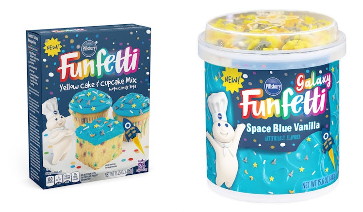 Whether you decide to make cake or cupcakes with these babies is entirely up to you. But to top off whatever you end up baking (or to eat straight out of the jar), make sure to check out Pillsbury's Funfetti Galaxy Space Blue Vanilla Frosting. According to the brand, it matches the colors of the newest Funfetti cake, and it comes with sprinkles in the shape of yellow stars, orange moons, and grey spaceships. It's far out, man.